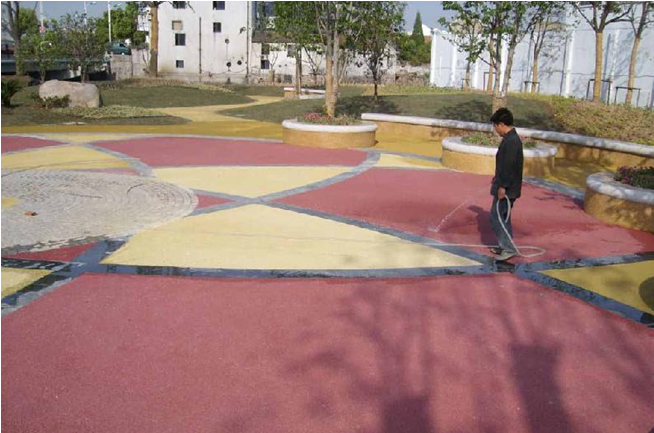 透水地面由透水混凝土固化而成,透水混凝土又稱多孔混凝土,其是由骨料、水泥和水拌制而成的一種多孔輕質(zhì)混凝土,它不含細(xì)骨料, 由粗骨料表面包覆一薄層水泥漿相互粘結(jié)而形成孔穴均勻分布的蜂窩狀結(jié)構(gòu),故具有透氣、透水和重量輕的特點(diǎn)